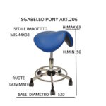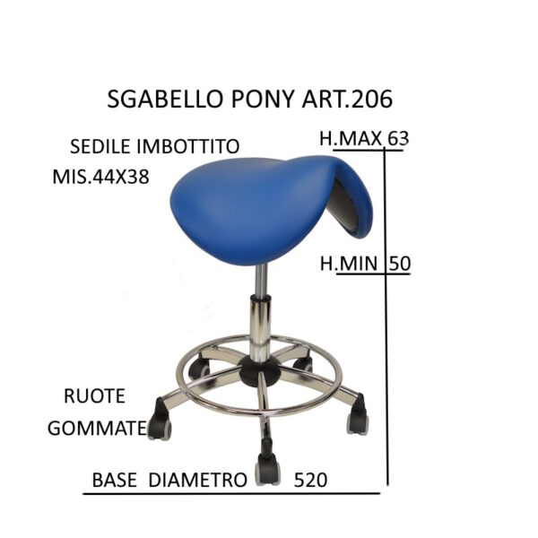 Sgabello in acciaio cromato girevole regolabile in altezza con pompa a gas che permette una regolazione da un’ altezza minima di 48/60 centimetri ad una massima di 60/72 centimetri, in base all’ esigenza . Il sedile e’in schiumato mentre lo schienale e’ imbottito con finitura skay finta pelle .La base a 5 razze con anello poggiapiede con finitura cromata . Questo articolo e’ fornito di ruote gommate art. PAG11 (smontabili per la pulizia).