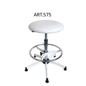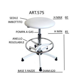 Sgabello in acciaio verniciato bianco girevole regolabile in altezza con pompa a gas che permette una regolazione da un’ altezza minima di 60 centimetri ad una massima di 85 centimetri.Inoltre completo di anello regolabile con un diametro di 45 centimetri che permette una buona regolazione ed un buon appoggio dei piedi. Il sedile e’ imbottito in ecopelle bianco con un diametro di 40 centimetri .La base a 5 razze con finitura verniciata. Questo articolo e’ fornito di piedini +kit ruote gommate .