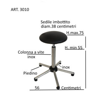 Sgabello in acciaio inox aisi 304 girevole con seduta e schienale in ecopelle .La regolazione e’ con colonna a vite con un’altezza minima di 55 centimetri ed un’altezza massima di 75 centimetri . Il sedile ha un diametro di 38 centimetri.Lo schienale imbottito in ecopelle .La base e in acciaio inox con diametro di 56 centimetri con piedini ,oppure e’ possibile montare anche le ruote .