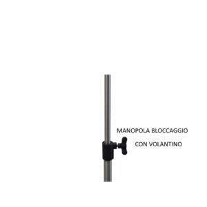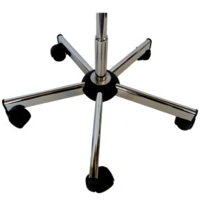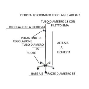 Piedistallo in acciaio cromato , regolabile in altezza con volantino che permette una regolazione a scelta dell’ utilizzo a richiesta . La base ha un diametro di 58 centimetri che permette una buona stabilita’ .Sulla base vengono inserite delle ruote in plastica girevoli .