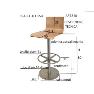 Sgabello in acciaio inox aisi 304 girevole con seduta in legon di faggio . Il sedile ha un sistema di rotazione che permette, quando la persona si alza di ritornare sempre nella stessa posizione . L’ appoggiapiede e’ ad un altezza di 35 centimetri con un diametro di 41 centimetri ,la base disco con uno spessore di 8 mm, ha un diametro di 40 centimetri con n.04 fori per fissaggio a pavimento .
