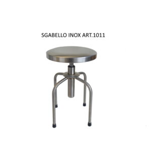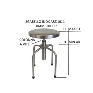 sgabello in acciaio inox aisi 304 girevole regolabile in altezza con vite che permette una regolazione da un ‘altezza minima di 48 centimetri ad una altezza massima di 61 centimetri. Il sedile è acciaio inox con un diametro di 33 centimetri. La struttura è costruita in tubo diametro 20 a 4 gambe . La finitura è in acciaio inox 304