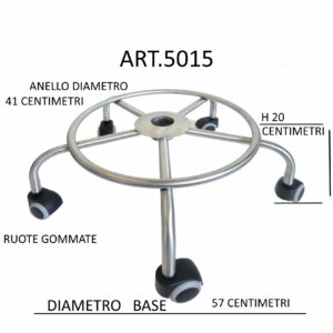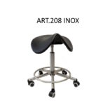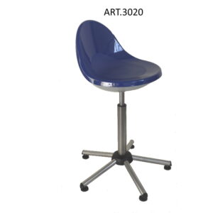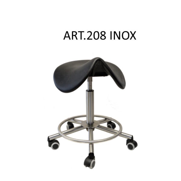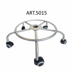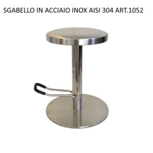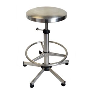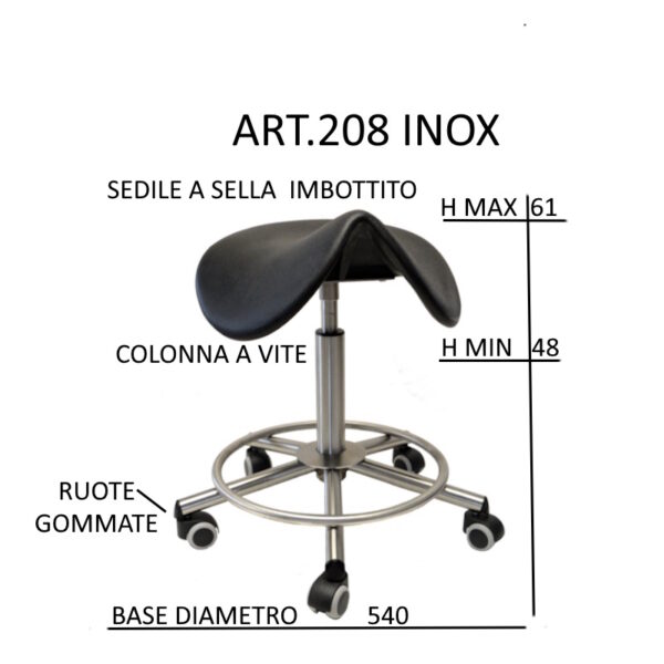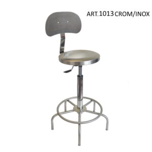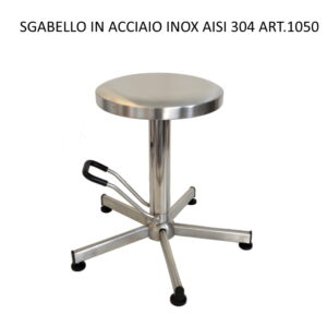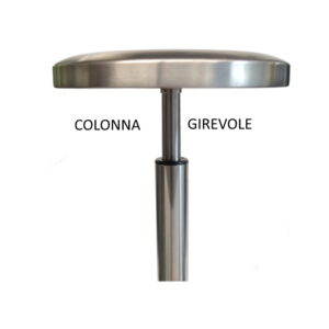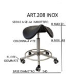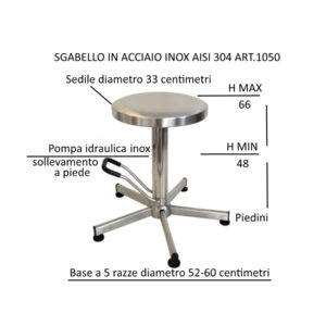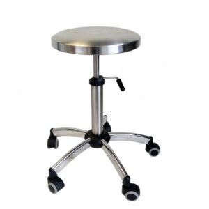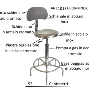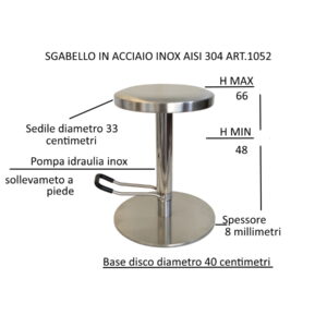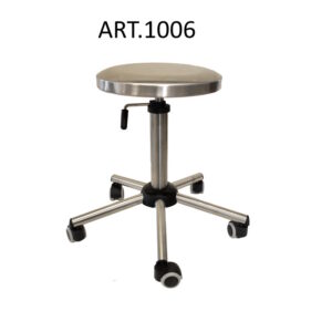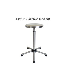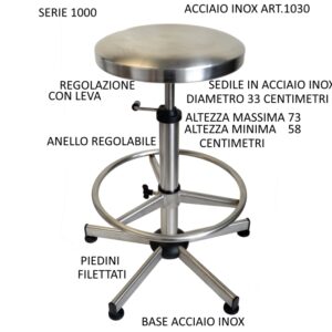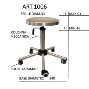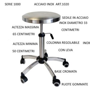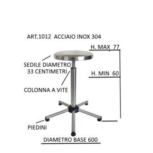 Sgabello in acciaio inox girevole regolabile in altezza a vite, che permette una regolazione da un’ altezza minima di 48 centimetri ad una massima di 61 centimetri. Il sedile e’ imbottito con colori a richiesta .La base a 5 razze con anello poggiapiede con finitura acciaio inox . Questo articolo e’ fornito di ruote gommate